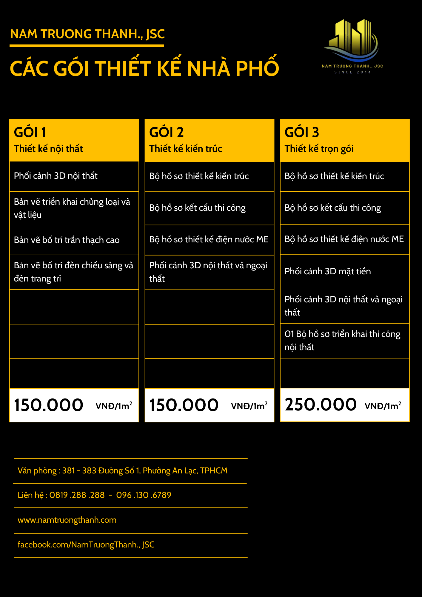 Công ty Nam Trường Thành JSC mang đến bảng báo giá thiết kế nhà với ba gói dịch vụ đa dạng, phù hợp cho cả nhà phố và biệt thự. Mỗi gói thiết kế sẽ được cá nhân hóa theo yêu cầu của bạn, giúp hiện thực hóa giấc mơ về ngôi nhà sang trọng và tiện nghi.
