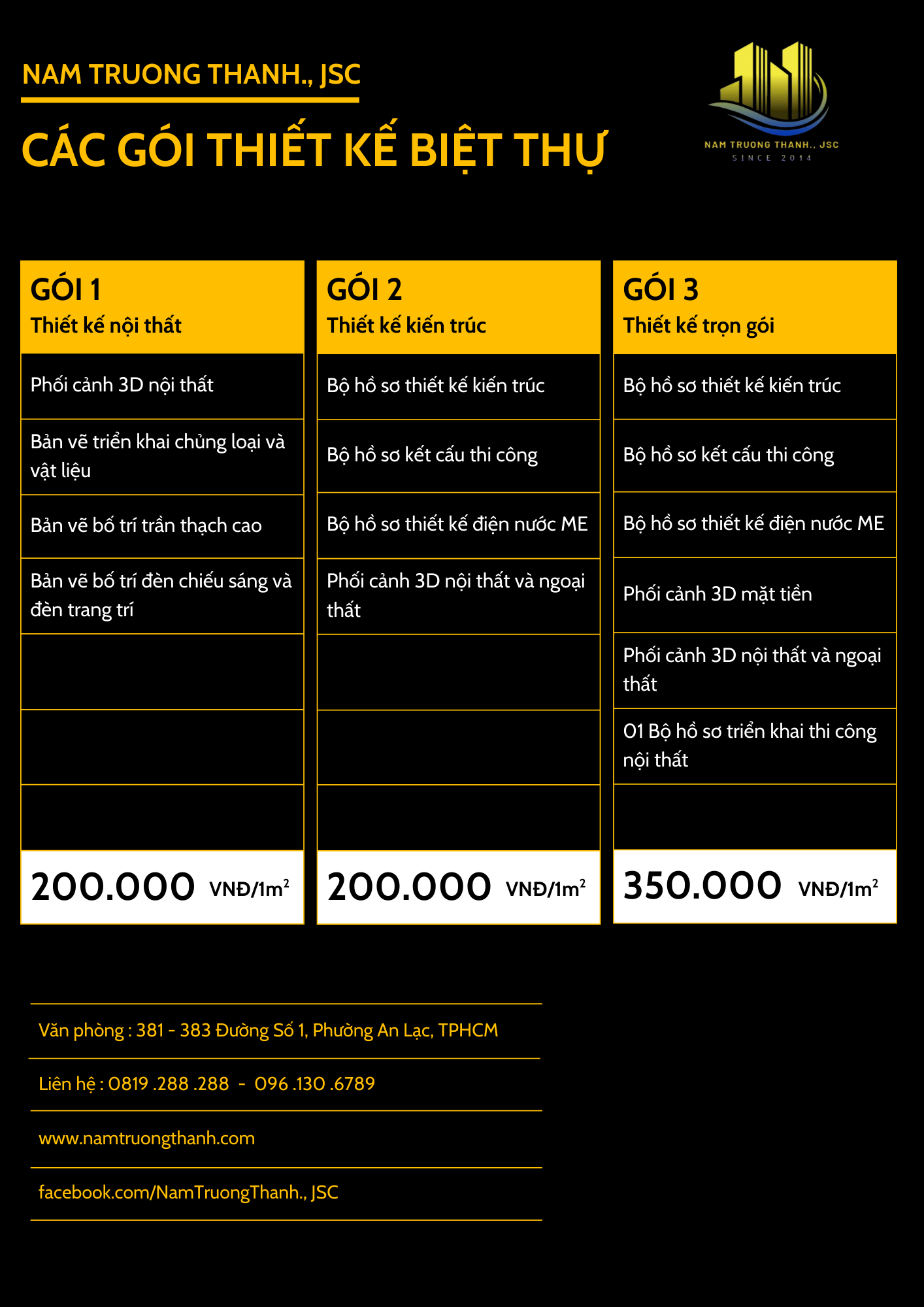 Công ty Nam Trường Thành JSC mang đến bảng báo giá thiết kế nhà với ba gói dịch vụ đa dạng, phù hợp cho cả nhà phố và biệt thự. Mỗi gói thiết kế sẽ được cá nhân hóa theo yêu cầu của bạn, giúp hiện thực hóa giấc mơ về ngôi nhà sang trọng và tiện nghi.