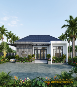 Điểm nhấn đầu tiên khi nhìn vào tổng thể một mẫu nhà vườn mái Nhật chính là hệ mái dốc nhẹ đặc trưng. Khác với độ dốc lớn thường thấy của mái Thái, mái Nhật ở dự án này được tính toán với tỉ lệ vừa phải, đủ để thoát nước mưa tốt nhưng vẫn giữ được độ thấp giúp căn nhà trông gần gũi với mặt đất hơn.