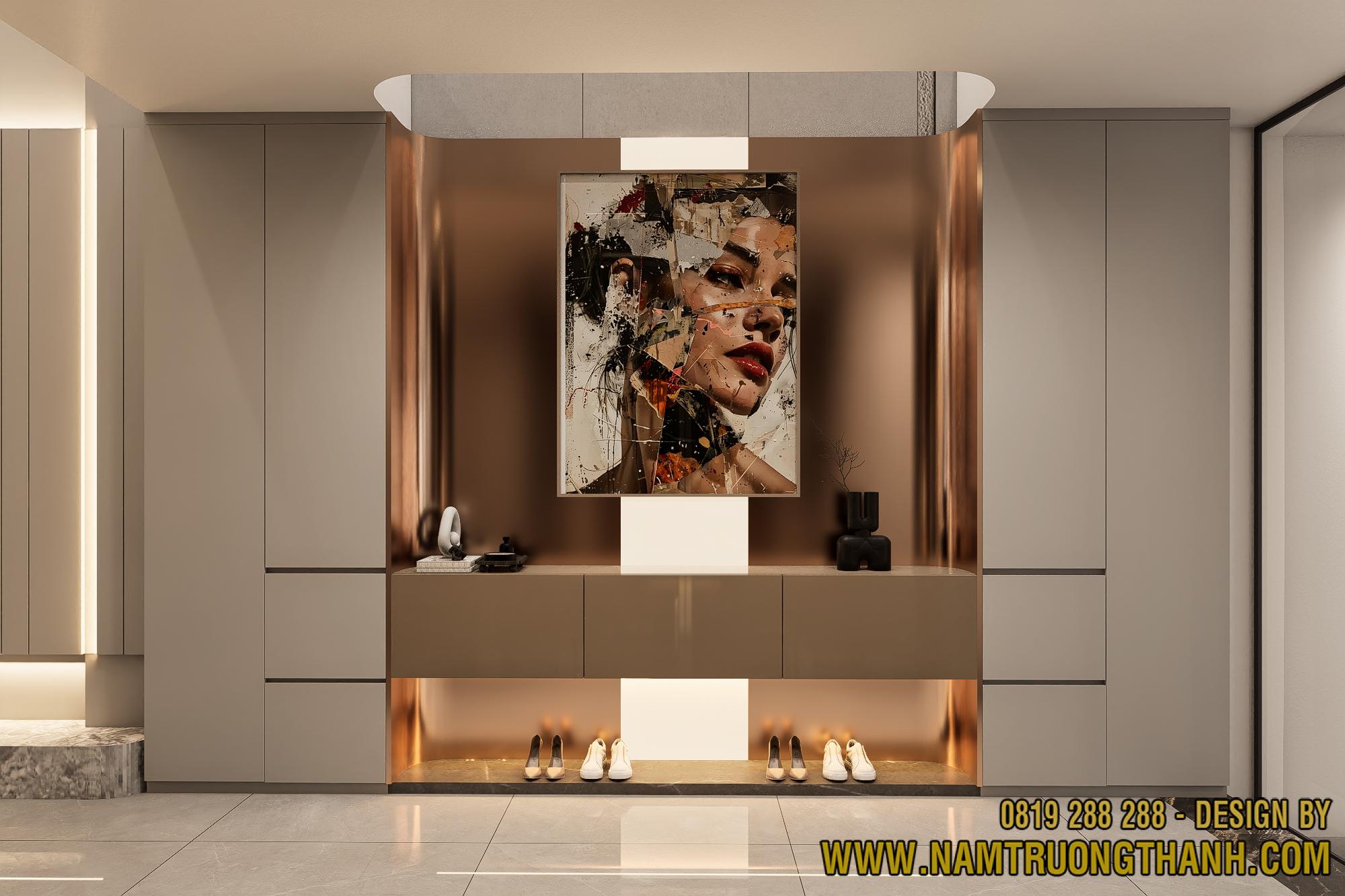 Điểm nhấn kim loại: Các nẹp inox mạ màu rose gold chạy dọc không chỉ che đi các mối nối mà còn tạo ra những đường line dẫn dắt ánh sáng.