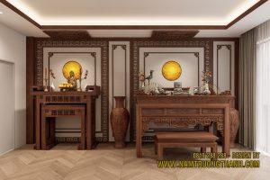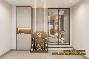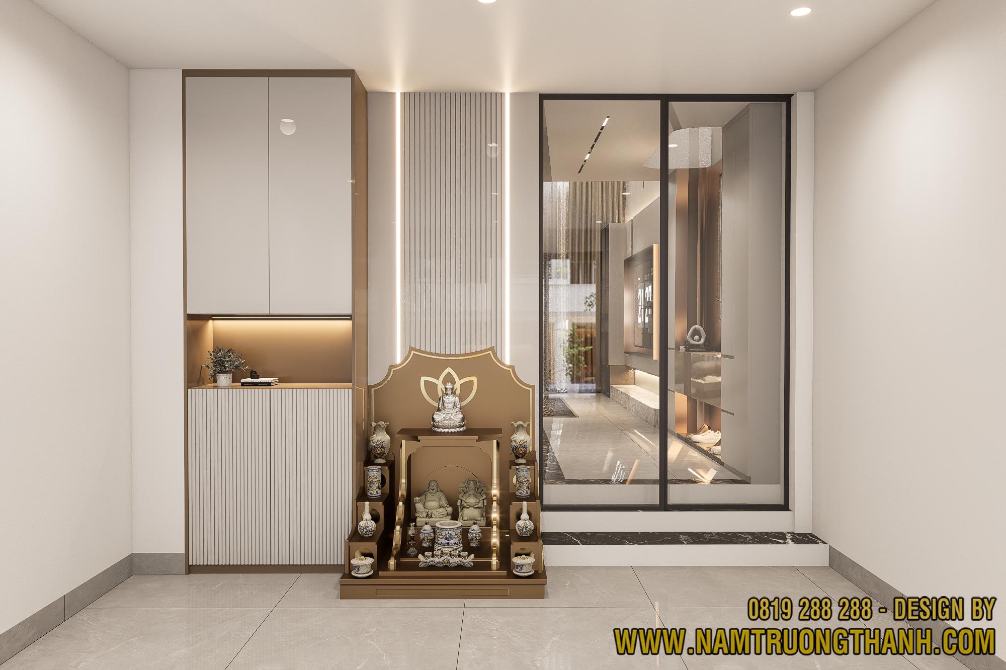 Khu vực tâm linh trong dự án nội thất nhà phố thông tầng là sự kết hợp nhuần nhuyễn giữa truyền thống và vẻ đẹp hiện đại, tôn vinh giá trị gia đình.