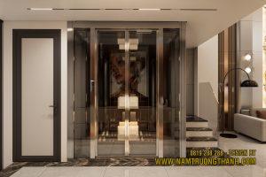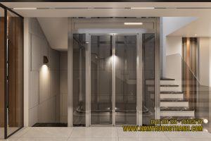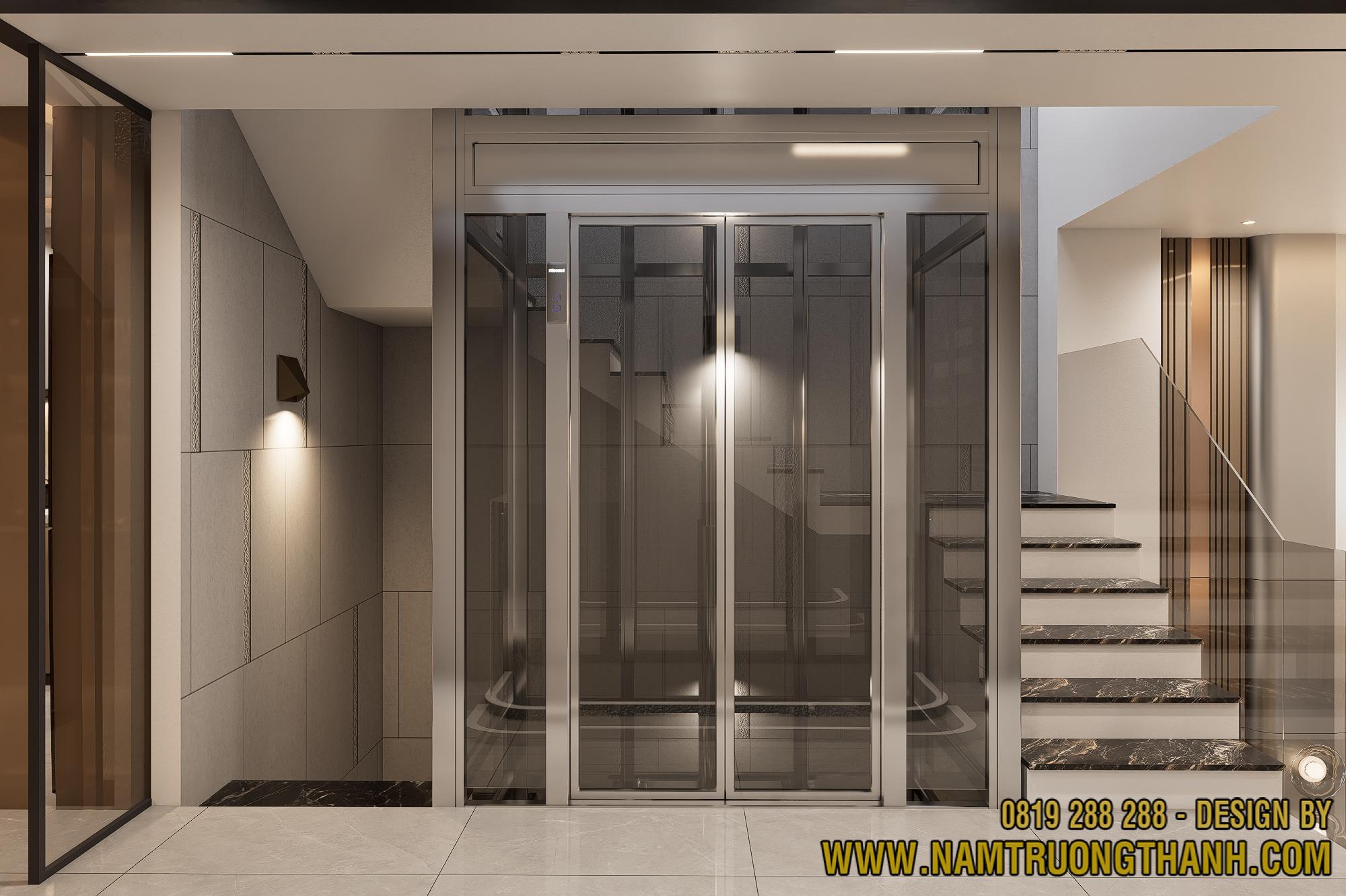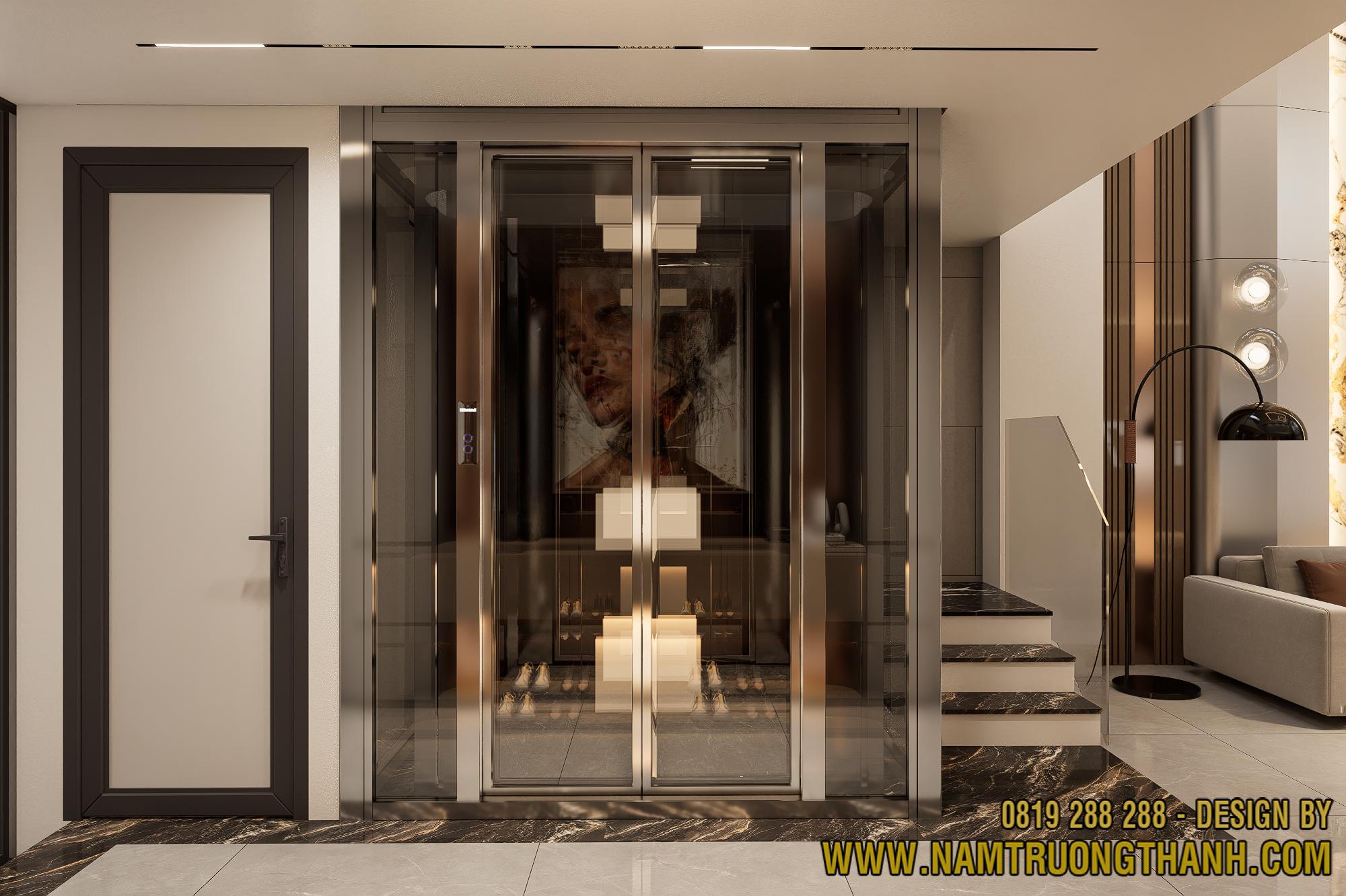 Hệ thang máy kính khung inox mạ vàng đồng lộng lẫy ngay sảnh chính, giữ tầm nhìn xuyên thấu không đứt đoạn – giải pháp đắt giá cho nội thất nhà phố thông tầng hiện đại.