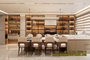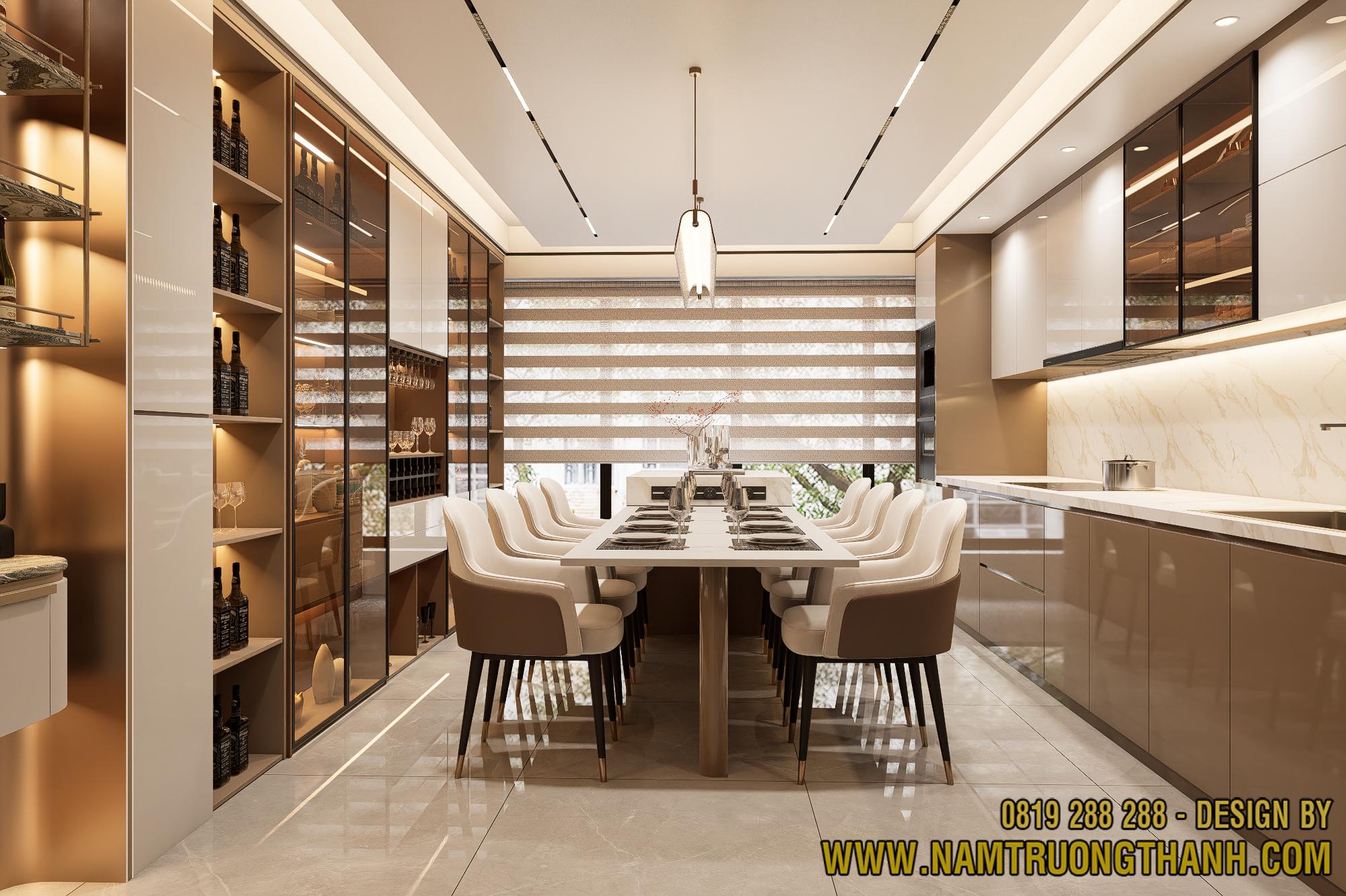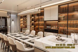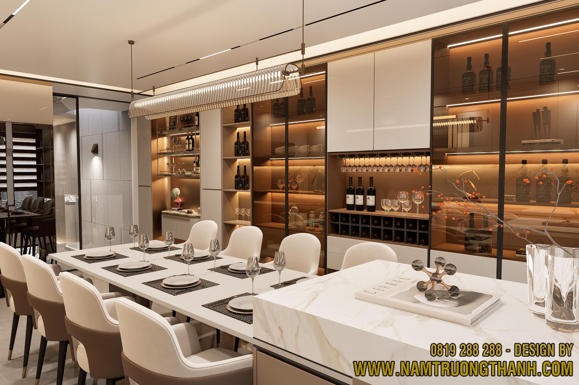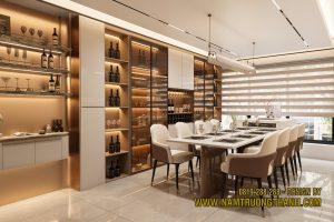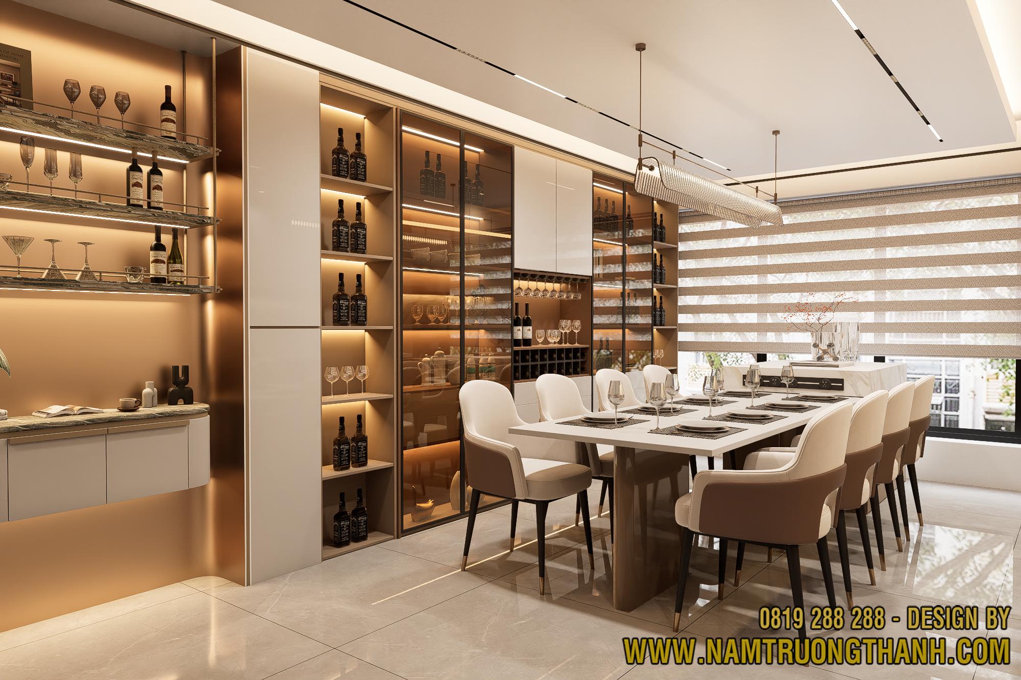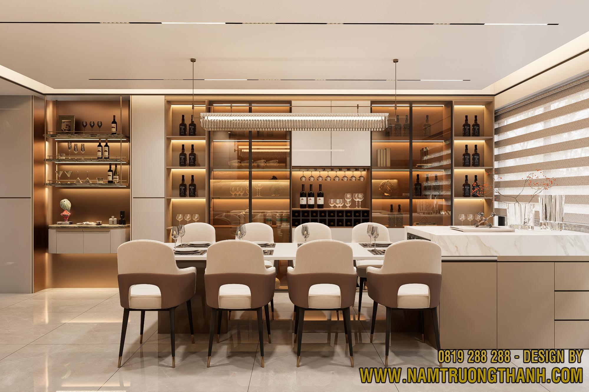 Đối diện với bàn ăn là hệ tủ rượu được thiết kế cực kỳ hoành tráng, chiếm trọn mảng tường lớn.