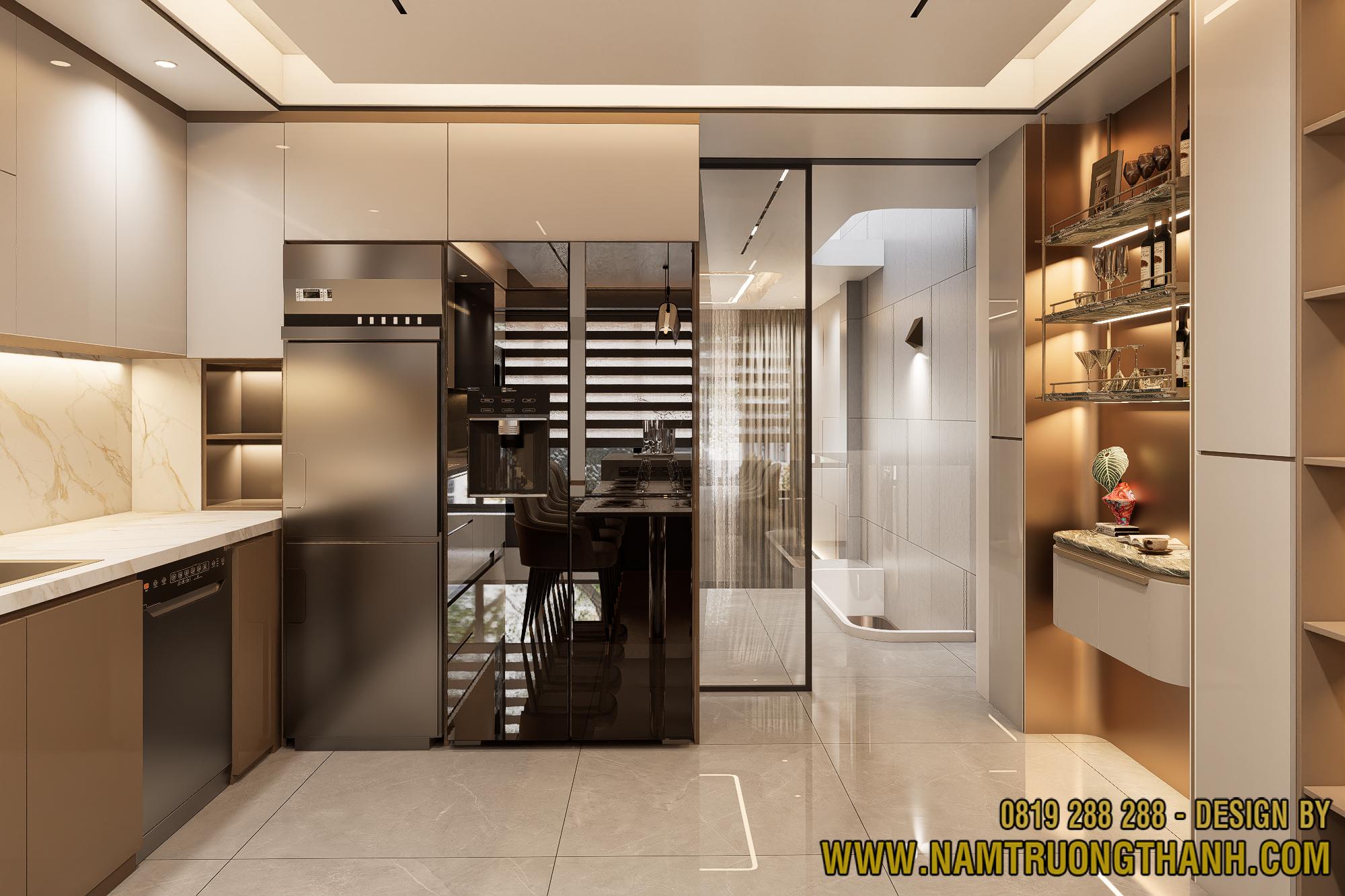 Sự thống nhất vật liệu: Mặt gương đen của cả 2 tủ lạnh tạo thành một mảng màu trầm đồng nhất, tương phản hoàn hảo với tông màu gỗ sáng của tủ rượu phía đối diện và màu beige của tủ bếp.