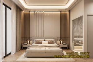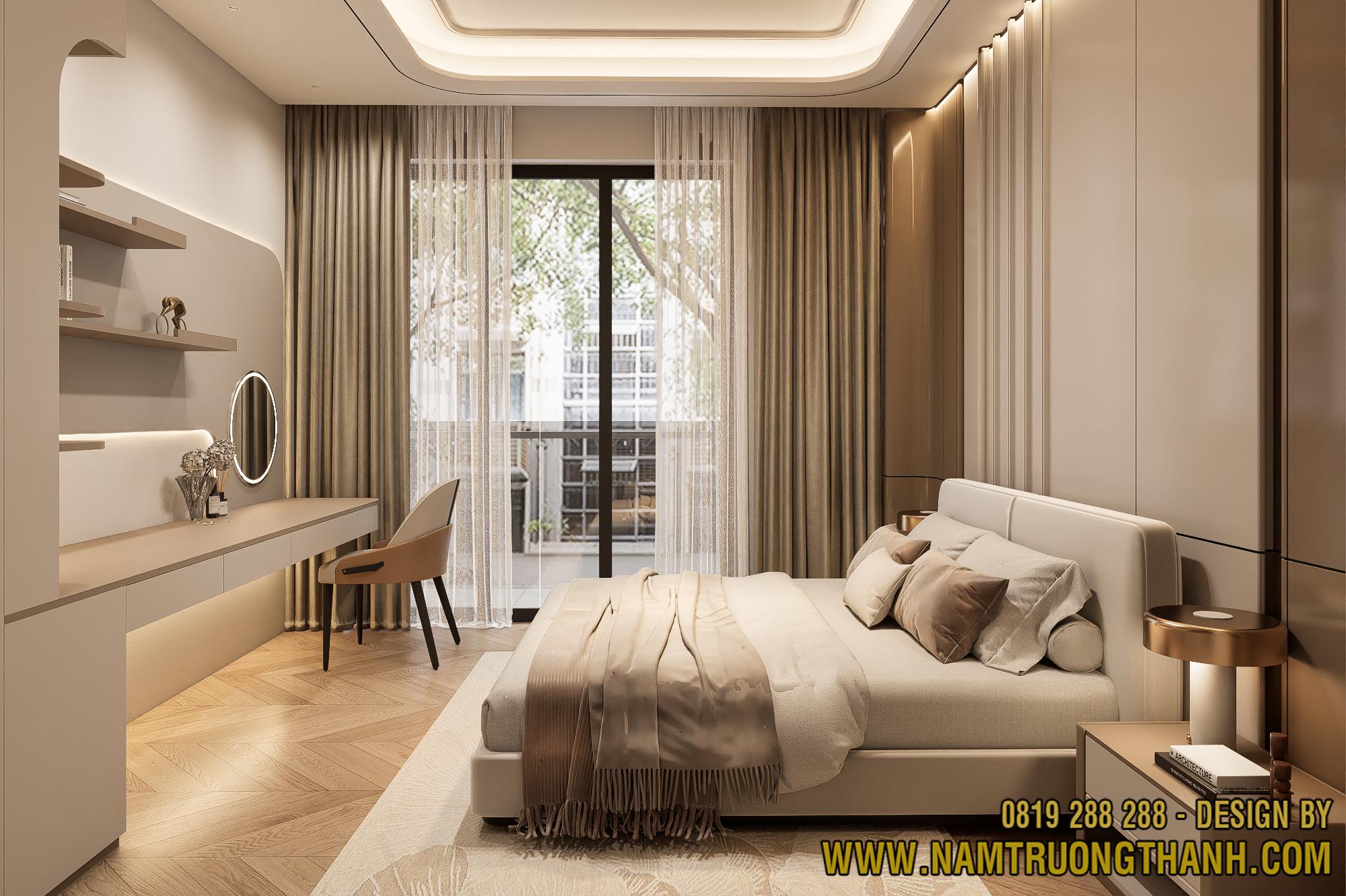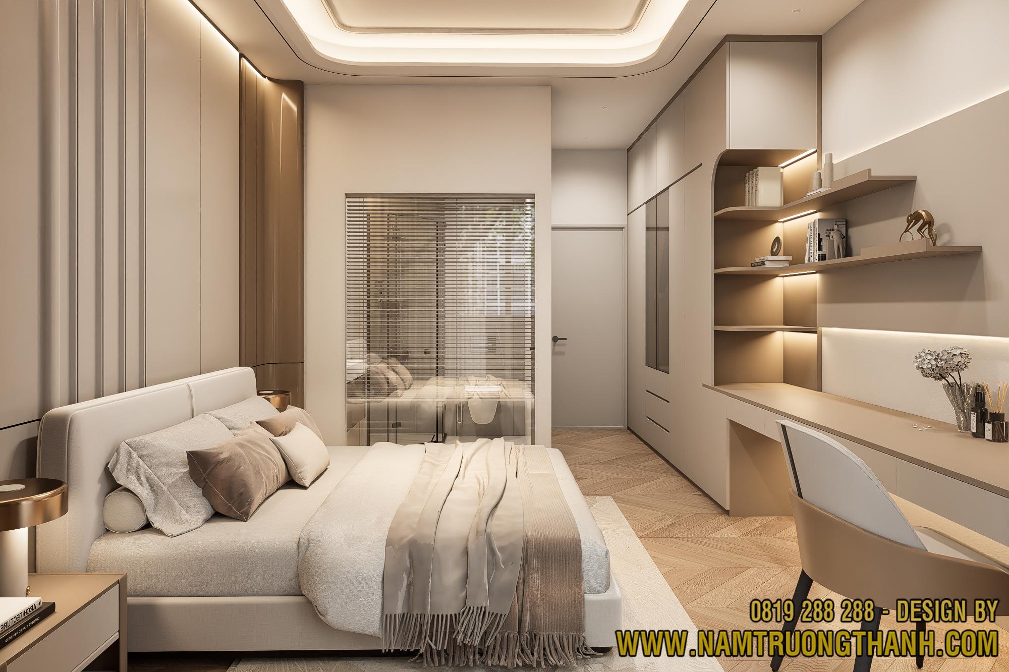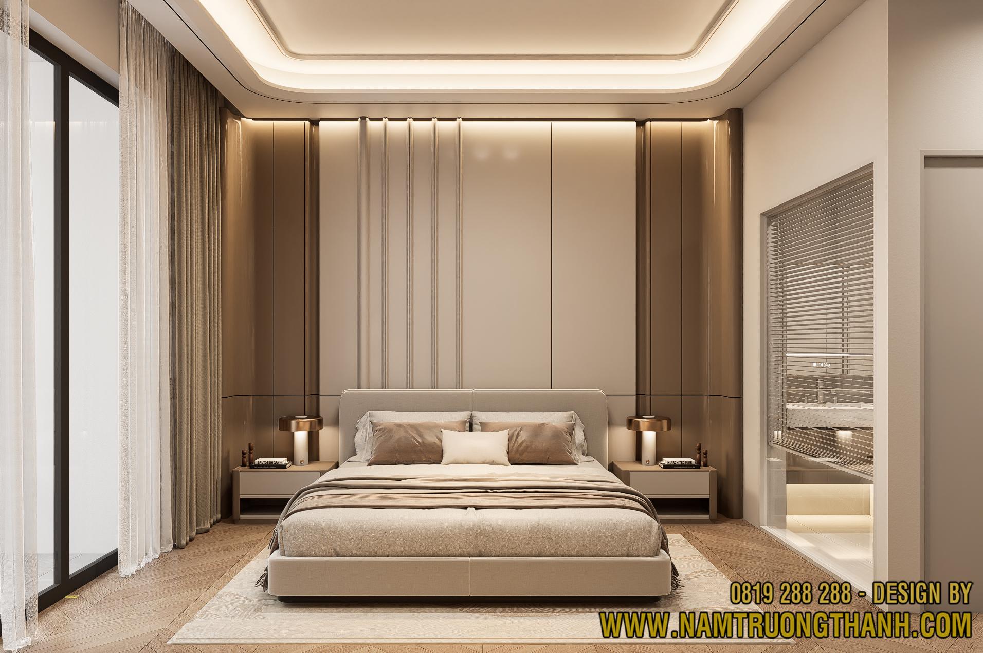 Ngay khi ngả lưng xuống chiếc giường êm ái, ánh mắt bạn sẽ chạm vào hệ vách đầu giường được xử lý vô cùng khéo léo. Để tạo sự đồng bộ cho tổng thể nội thất nhà phố thông tầng, anh em thiết kế đã kết hợp các lớp vật liệu màu beige sơn mờ xen kẽ với những đường nẹp đồng sang trọng, tạo điểm nhấn bắt mắt nhưng không hề gây cảm giác nặng nề.