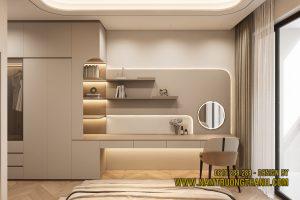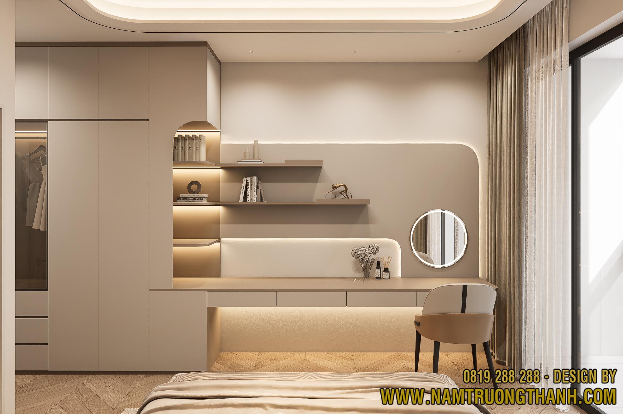 Nối liền với hệ tủ quần áo là chiếc bàn trang điểm dài, nơi có chiếc gương tròn lung linh làm điểm nhấn. Đây là khu vực yêu thích để gia chủ sửa soạn mỗi sáng, với các kệ mở bo góc bên cạnh đủ để trưng bày những món đồ mỹ phẩm hay túi xách yêu thích một cách tinh tế nhất trong không gian nội thất nhà phố thông tầng của mình.
