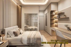 Sau những choáng ngợp tại khoảng thông tầng ngoài phòng khách, bước chân vào phòng ngủ, bạn sẽ cảm nhận ngay một nhịp sống chậm lại, yên tĩnh và cực kỳ thư thái. Trong dự án nội thất nhà phố thông tầng lần này, chúng tôi không muốn tạo ra một căn phòng để ngủ thuần túy, mà là một không gian nghỉ dưỡng thực thụ.