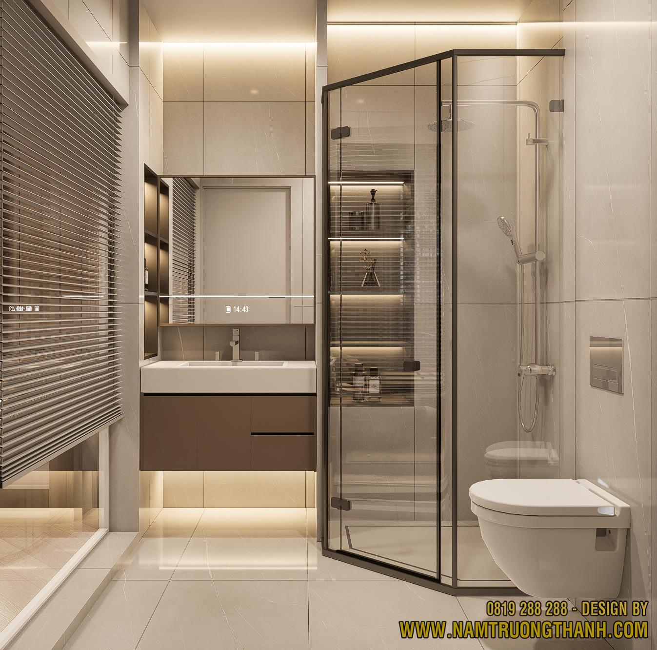 Trong một dự án nội thất nhà phố thông tầng, ngay cả phòng vệ sinh cũng được thiết kế theo tiêu chuẩn nghỉ dưỡng để mang lại sự thư giãn tối đa. Không gian này tiếp tục sử dụng tông màu trung tính và vật liệu cao cấp, tạo sự đồng bộ hoàn hảo với tổng thể căn nhà.
