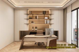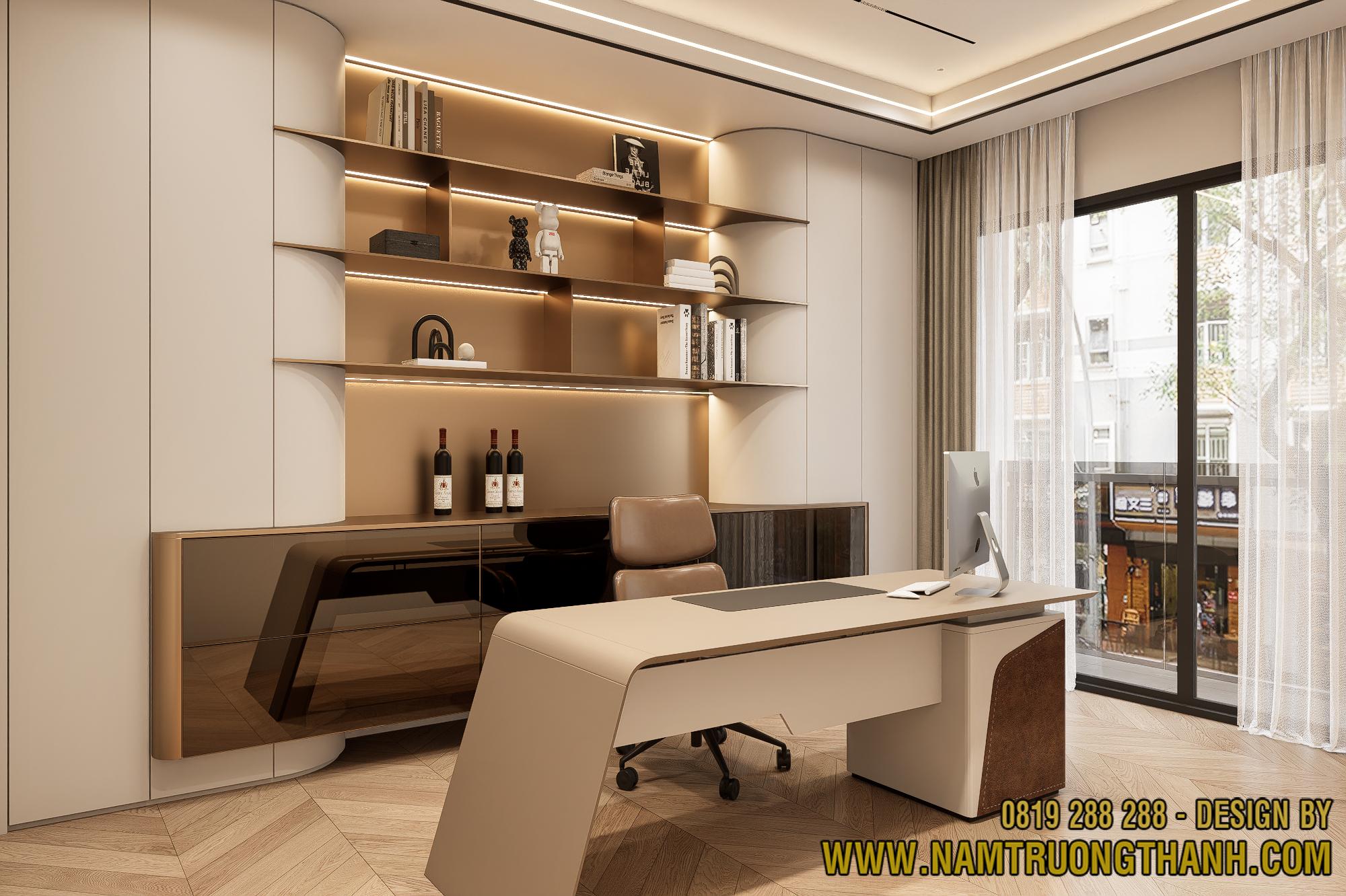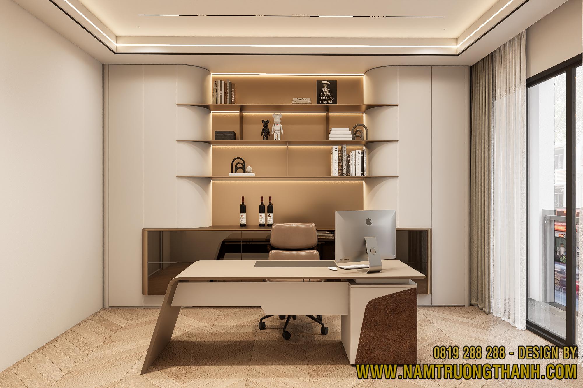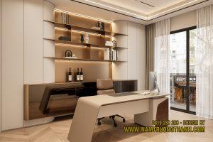 Trong phương án nội thất nhà phố thông tầng, phòng làm việc được thiết kế để vừa đảm bảo sự yên tĩnh, vừa thể hiện gu thẩm mỹ cá nhân của gia chủ.