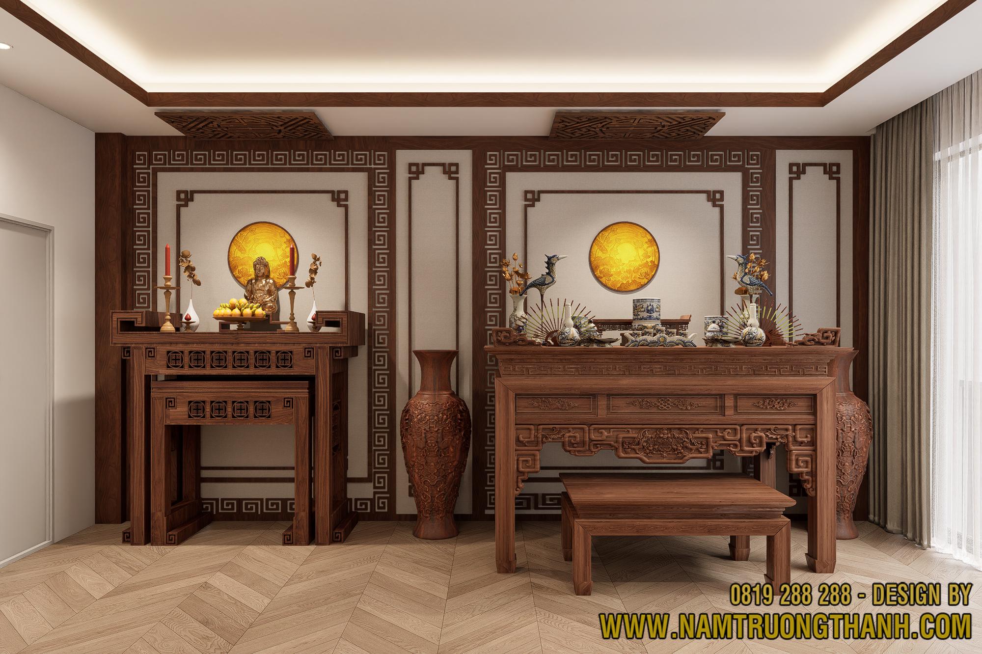 Vật liệu gỗ truyền thống: Sử dụng gỗ gụ với tông màu nâu trầm và các chi tiết chạm khắc tinh xảo, tạo nên sự bề thế và trang nghiêm tuyệt đối.