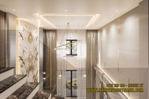Trong dự án nội thất nhà phố thông tầng này, khu vực giao thông không chỉ để di chuyển mà còn là linh hồn kết nối sự sang trọng.